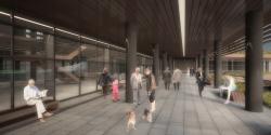 A forecourt facing the main arrival direction and uniting with the neighboring green area was created on the east side of the plot by pushing the building to the setback border on the North. The open space was lowered to -4.73 level and half of the commercial area was solved in a way encircling the sunken public courtyard. A sheltered walkway reaching the main municipality entrance was created in the portion sliced off from the ground floor and lowered to the forecourt level. The municipality and the street were visually united with the fully transparent façade between the entrance hall and the colonnade created in front. Street and courtyard levels were connected with stairs parallel to the pedestrian axis. Both the looks and the use of the open space were enriched by integrating landscape and amphitheatre functions to the stairs entirely surrounding the plaza on the street side. It is anticipated that the forecourt, which is sheltered from the prevailing wind by the building mass, will serve as an open public space used day and night.