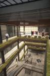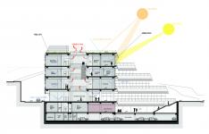 The rainwater collected from the roof surfaces and the surrounding landscaping into the large volume tank in the basement floor will be used for the watering of the plants, as well as closets and urinals.