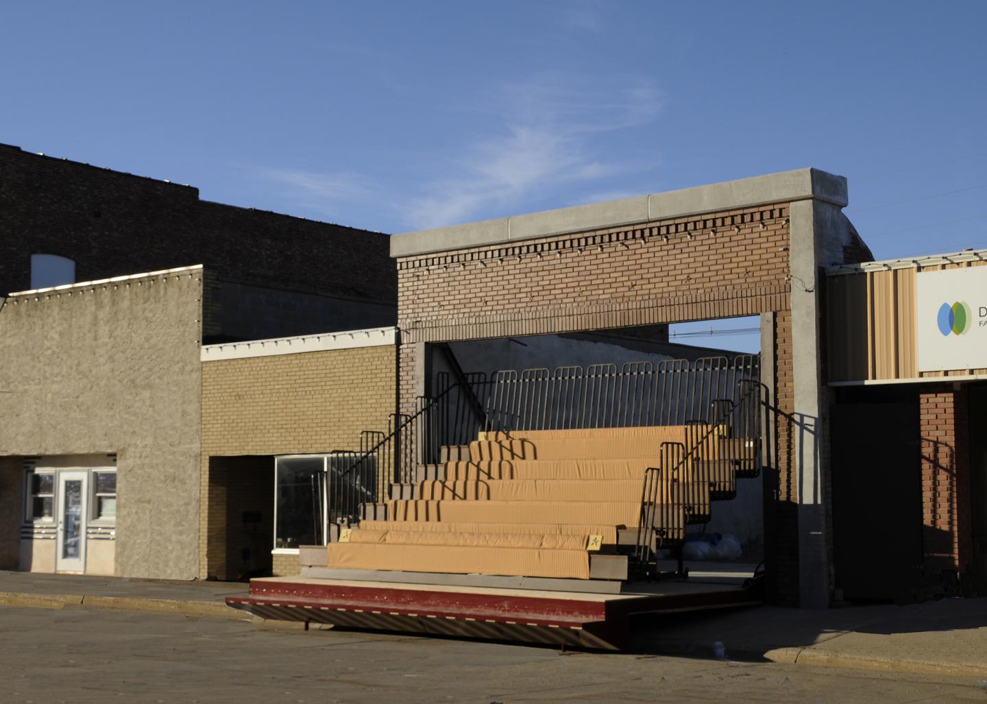 THE STOREFRONT THEATER is a unique event space that transforms Main Street into an outdoor theater by using an abandoned freestanding storefront wall in downtown Lyons, Nebraska as its site. The wall is modified with two hydraulic pump arms so that the awning and false front fold down over the sidewalk with the push of a button, providing seating for 100. Both the seats and the screen retract and disappear when not in use, giving the impression that there is nothing unusual in this town, leaving only word-of-mouth accounts for inquiring visitors.