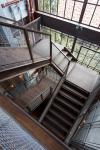 The large industrial-type iron frameworks enable the entry of natural lighting during the day and constant integration with the outside gardens and a view of the city from the roof.