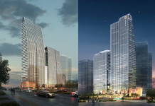 The commercial office tower, designed to standards for Class A office buildings, is approached and entered from the north plaza. The grand office lobby lies directly beneath the split of the two tower forms and contains an interior open space of 14.5M tall that connects directly to the main, 3-zone elevator lobby.