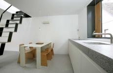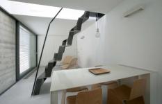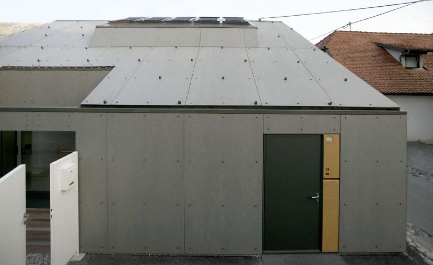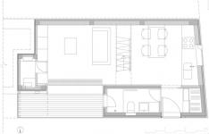 XXS House is located in the neighborhood Krakovo, which is situated in the city centre of Ljubljana. Krakovo has a structure of a historical village, which was supplying the nearby monastery with fresh food in the Middle ages and is today highly protected historical area. The basic dimensions of the new house were already defined by law according to the volume of the pre-existing hundred years ago working as a service building of a traditional house next-door. The task was to integrate all residential functions in an extra small volume to suit the needs of a couple living in countryside for their new urban holiday-home. Since the house faces north, it was a challenge to bring the direct and in-direct sunlight to the living spaces in the ground floor. The heritage protection rules allow light shafts on the roofs, but in this case we turned them towards the sky. This major alternation of the volume opened up new attic space suitable for use. A huge wall size slide window opens up the space to the intimate atrium and allows for indirect lighting. The selection of the facade materials and detailing established the desired service appearance of the house. The concept of raw materials stretches from exterior to interior – using fibre cement panels in their primer mode for the roof and yard facade and ‘raw concrete’, terrazzo, plywood, iron for the indoor. The total area of 43m2 ultimately names the house –XXS.