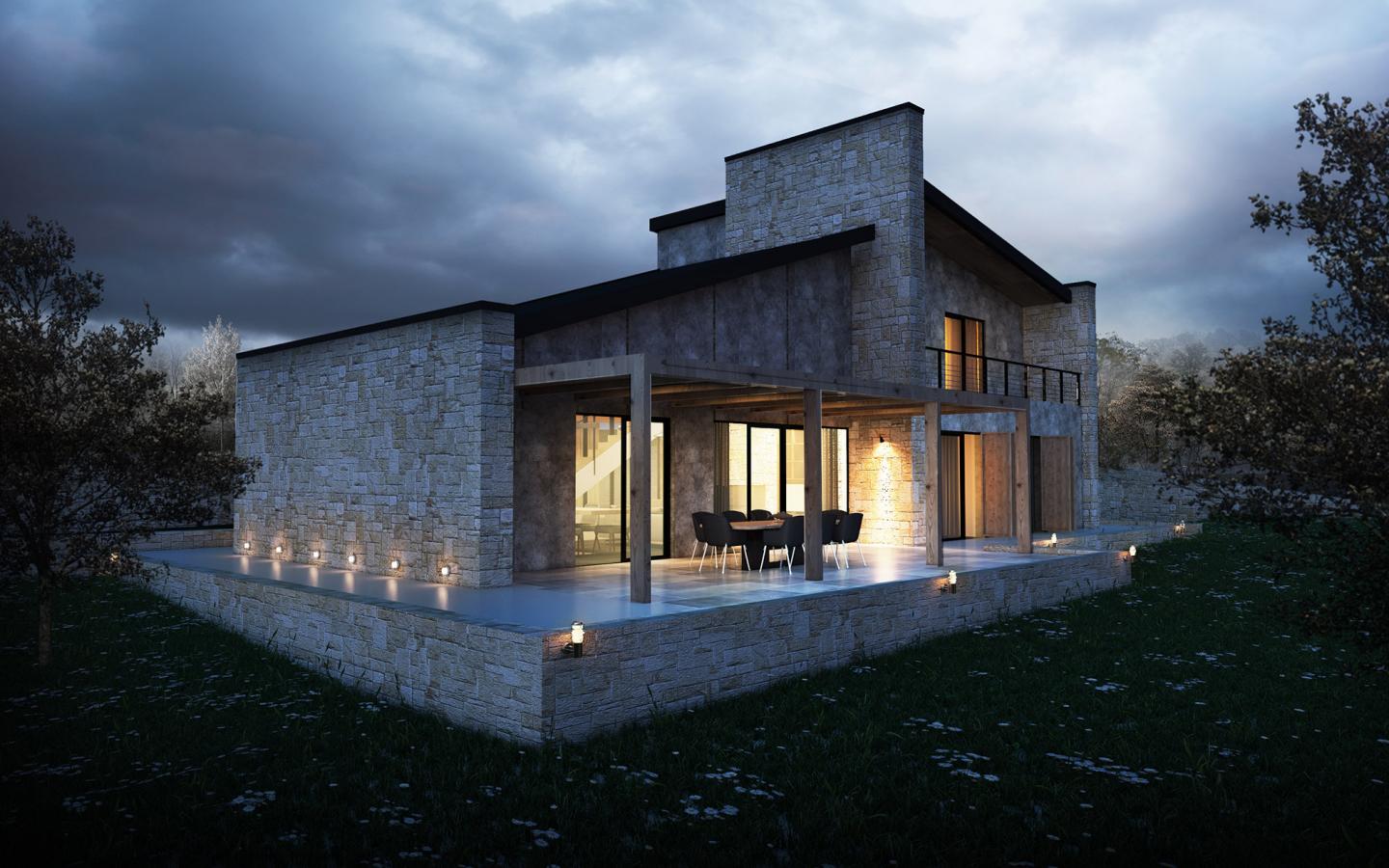 The plan of the building is organized by utilizing three main walls that define the living and resting spaces. These walls, built out of the famous local stone, are continued in the interiors and are also loaded with additional functions (i.e. passive ventilation, storage, bookshelf) to enhance the life in the house.