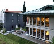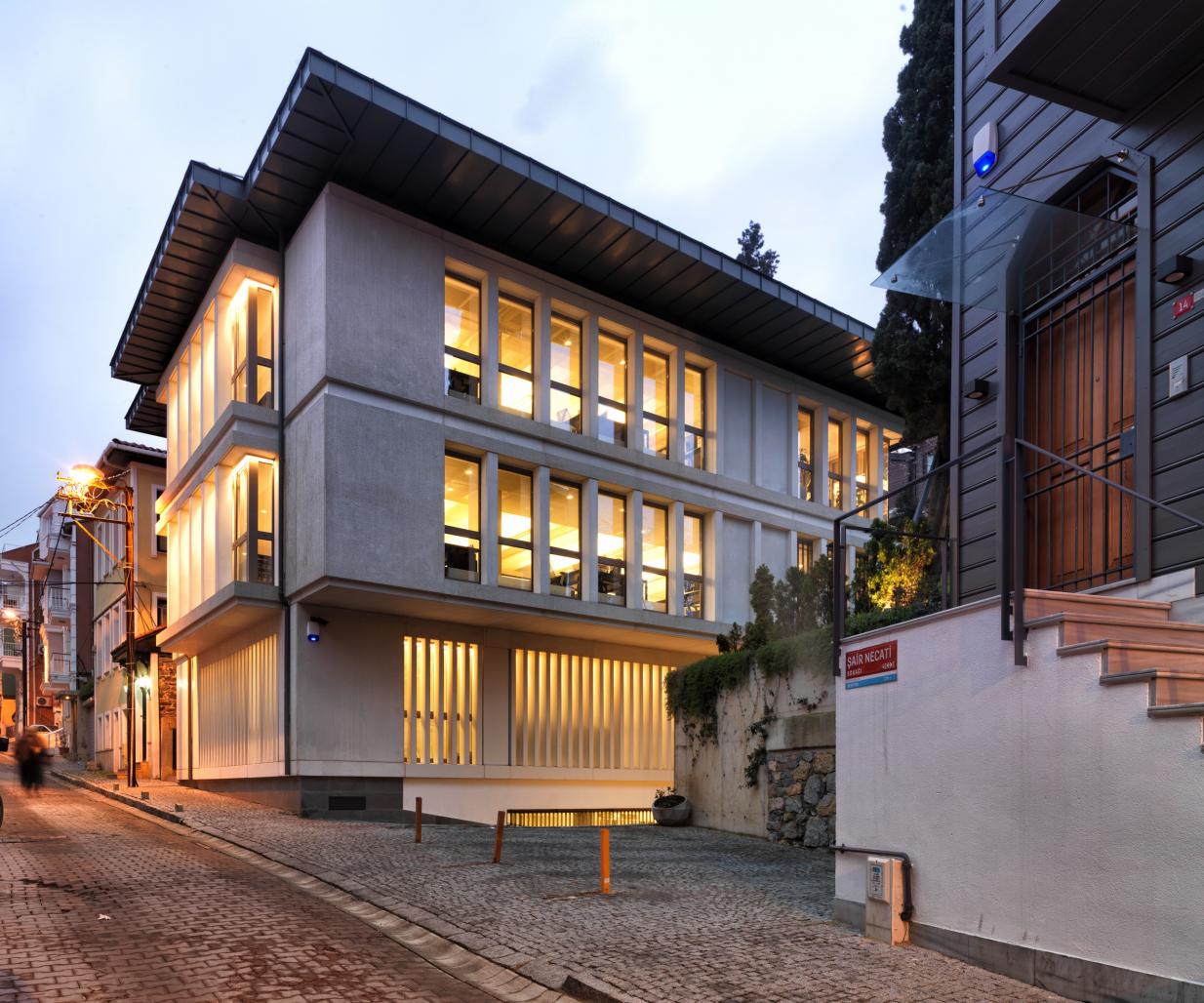 The building hosts 3 meeting rooms of different sizes adding up to 100 sqm, 215 sqm of open office space, roof level library and the model workshop, archives and recreation areas in the basement floors with a landscape that is sensitive to the existing surrounding.