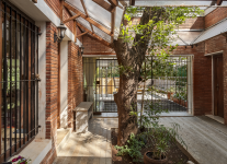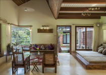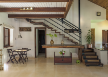 It is a load bearing, ground plus one structure with exposed brickwork of hollow bricks. The use of natural stones in outdoor spaces and of exposed brickwork is respecting the context of the rustic place. The hollow brick walls act as a natural thermal insulation.
