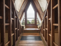 The single slab of granite platform is also hung from the roof and so is the wooden staircase partly suspended from the roof.