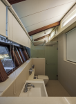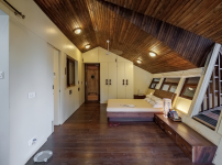 A part of the wall of the master bedroom falls down as a draw-bridge that allows access to a sundeck balcony in the dormer roof and a view of the roof and the garden below.