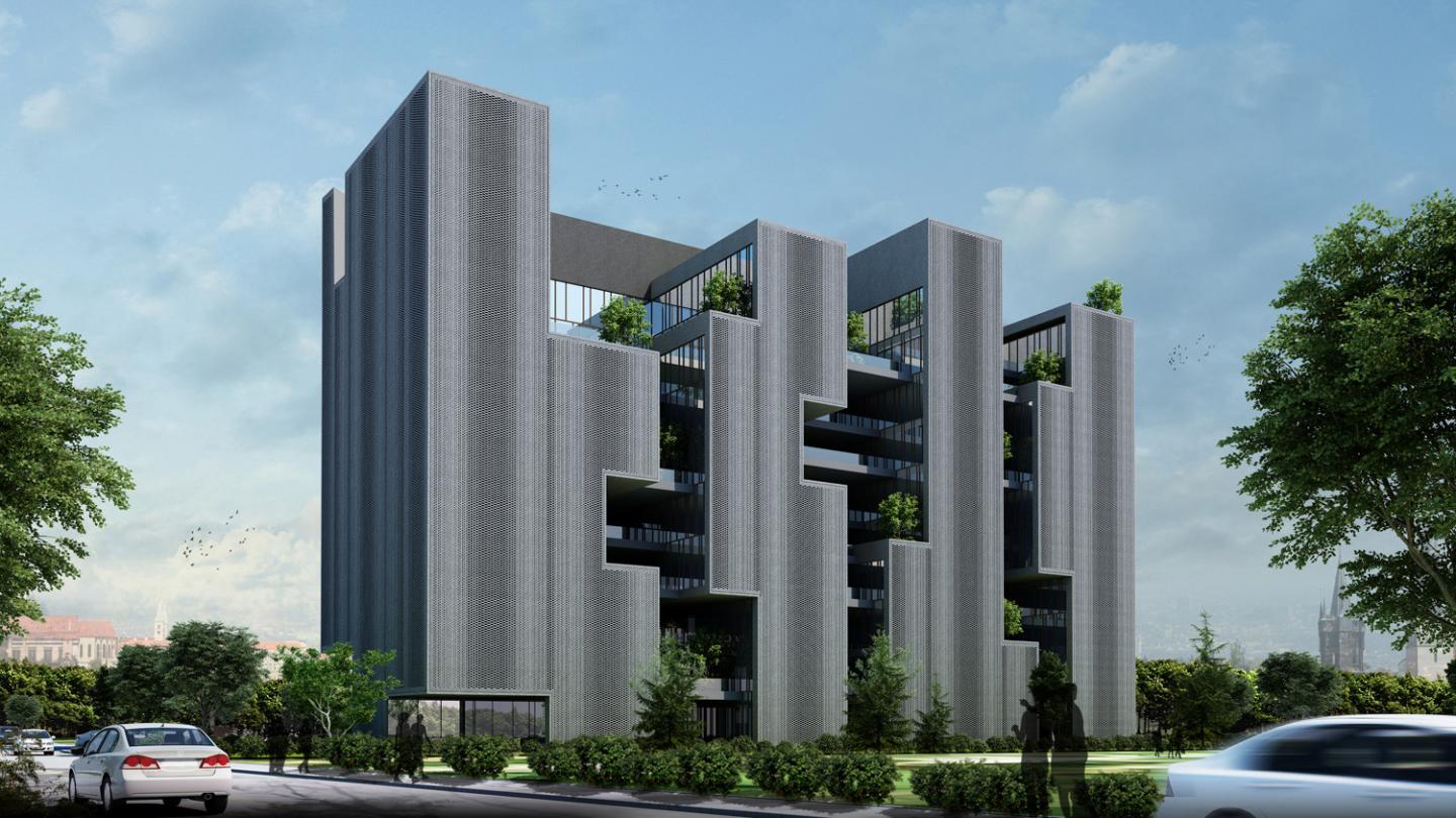 These interstitial incisions have stepped back landscaped terraces that are north facing. This allows each office space to have indirect natural light on 3 sides. The external sides of the building are constructed of brick screens that create privacy from the road and the adjacent developments to this relatively small plot.