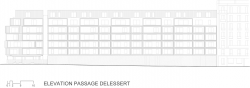 In 1891 the city of Paris registered this 100-meter passageway, open two years prior on the property of sieur Delessert, between the Rue Pierre Dupont and the Quai de Valmy. On the eastern end lies the Canal Saint-Martin, today an area for strolling and recreation, but in that period a thoroughfare leading to the Bassin de la Villette, the fourth largest industrial port after Marseille, Le Havre and Bordeaux. The activity of the port was intense and traces of it persist in some of the enormous industrial buildings, i.e., the Cité Clémentel, the former power station for the Compagnie d’Air Comprimé, among other more discreet buildings facing the street. The intervention embraces the context as a blend of populations, memories, and activities along with a wide variety of building types in a single area. The operation includes a gymnasium, sold off plan to the city of Paris, where 69 units of social housing are located. This intervention seeks first to achieve a hybridization of the grand industrial scale found in the area with the private scale of the housing unit. The building stands along the Delessert passageway, forming the angle of the two streets before turning back toward the rue Pierre Dupont with the use of a loggia motif on five levels built in larch wood, without there being any intention of erasing or diminishing its presence or hiding the major changes brought on by its arrival on this empty lot of the neighborhood, a bucolic vacant space long occupied by a prefabricated structure and an inflatable structure housing abandoned tennis courts.