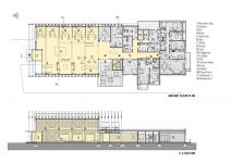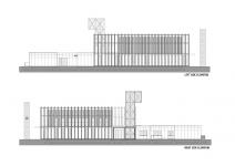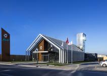 The high ceiling part of the gable roof structure has a sales office and exhibition hall. The back part where the terrace roof is has two mockup apartments and service spaces. In the design of the exhibition hall, an interior design in an industrial style was created using epoxy in the floor, steel structure and OSB in roof and walls, and natural wood in office platforms. On the facade, a metal shell was created to provide solar control of the building. The vertical mass of glass and steel is designed as a viewing platform for incoming customers to see the landscape around them. The terrace underneath the house is planned as a recreational courtyard where the guests can relax outside.