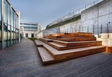 The ES-lab, being under the ground level, originally had one façade onto a sunken garden. This garden is preserved and enhanced by allowing the interior programs to extend onwards and into the garden. A new access ramp, the "canyon", is created on the opposite side and will become the main access for the Innovation Center. Inside, circular openings in the top slab allow for the creation of inner patios, brining light into the building and creating a visual link from inside to the top terrace.