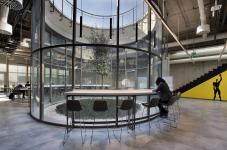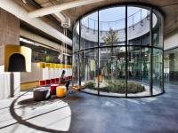 The ES-lab, being under the ground level, originally had one façade onto a sunken garden. This garden is preserved and enhanced by allowing the interior programs to extend onwards and into the garden. A new access ramp, the "canyon", is created on the opposite side and will become the main access for the Innovation Center. Inside, circular openings in the top slab allow for the creation of inner patios, brining light into the building and creating a visual link from inside to the top terrace.