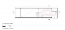 The main solution was to use cross section construction. From the south side that faces the street, a tree (Ternstroemia gymnanthera) was planted. The living room has 5.6m of ceiling height, "stairwell and stairs spaces", "4 layers of construction from basement to 3rd floor each rooms", "a small outside stairwell". Each floor is not piled up, but adopted the skip floor method, which made a gap. This method made it possible to see the outside street from the back rooms so, that it could be unified with outside of the house and create a larger atmosphere.