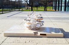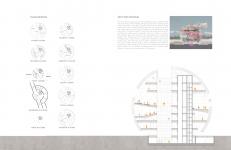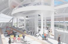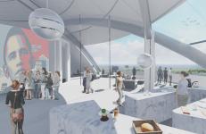 Once someone approaches the building they are greeted with two entrances. After walking along the path and traveling down under the water, one gets a great view from the glass ceiling overhead. Once in the building the first thing one notices is the large atrium that leads throughout the building as one goes up in the glass elevator, they can take stops and visit the auditorium where guest speakers put on a show, or where the scholars give their lectures. The next big stop is the grand public stair, people go here to be greeted by great views and reading areas. Also, there is space for meditation and group study areas. But the best view is when someone looks up and sees the archive system that is there, showing all of Obama’s presidency. After viewing all of this, one travels to the top floor where there is the outdoor viewing area and a public café/kitchen. People could host events in this space.