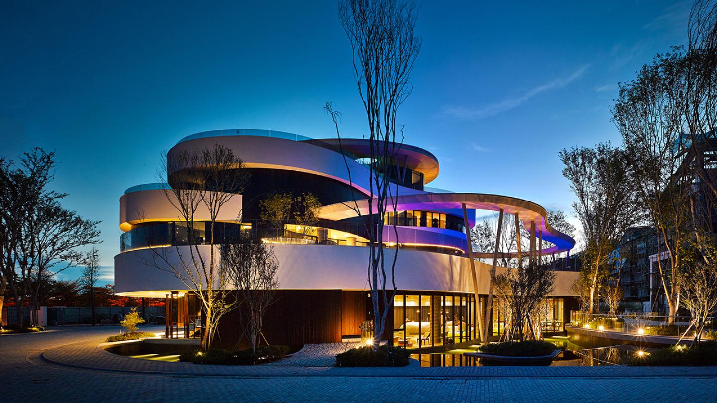 The building is located in Tainan, Taiwan, it is a shared space for the residents of the community. It provides spaces for dining, reading, exercising, learning, sharing and communication. The floors are stacked vertically as a series of free curves. The design is based on natural patterns and includes a reflecting pond, outdoor plaza and unobstructed views of the nearby hills. Varied surfaces with differing heights encourage people to walk in and explore the interior. Natural elements are brought into the building not only through its décor, but with a wall formed of tall trees. The result is a harmonious environment where human life maintains contact with nature.