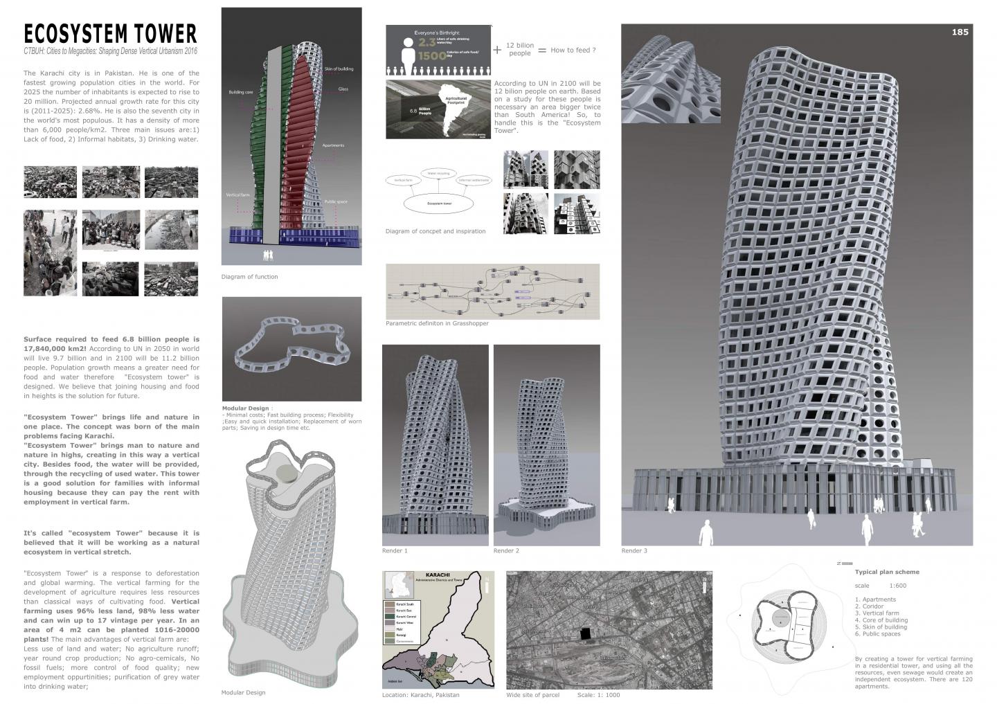 "Ecosystem Tower" brings life and nature in one place. The concept was born of the main problems facing Karachi. "Ecosystem Tower" brings man to nature and nature in highs, creating in this way a vertical city. Besides food, the water will be provided, through the recycling of used water. This tower is a good solution for families with informal housing because they can pay the rent with employment in vertical farm. Its called "ecosystem Tower" because it is believed that it will be working as a natural ecosystem in vertical stretch.