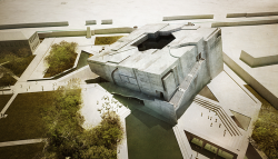 A future extension to the museum is considered in the concept design and planning, so that additional storage areas and communicating spaces can be successfully added. An twinned volume extension to the existing building is envisaged, with visitors following a mirrored circulation route, descending through the galleries from above.