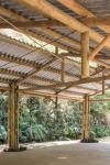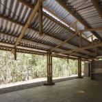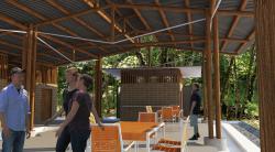 There’s a reinforced concrete floating slab that requires negligible excavation. The structure is all made from cultivated wood. Walls for the services core are exposed concrete block. The roof is a common pitched roof used in tropical areas and it’s made of recycled tetrapack (milk and drink containers) which was donated by a local milk company that manufacturers it. Rainwater will be free falling unto bioswales and water is returned to the aquifers. Some of it as well as gray waters may be used for toilets.