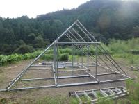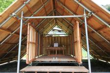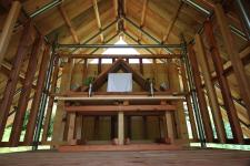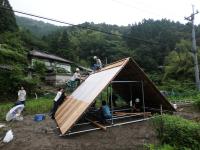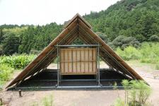 Because the community was only inhabited by one person, the expenses of the construction were extremely limited. Furthermore, the road to the site was really narrow, obliging the team to carry the construction materials for one kilometer. This led the temporary shrine to be self-built, with little money and with limited materials. The team consisted of ten students plus architect and in five days they erected the worship space with steel pipes for the scaffolding, wooden lumbers, and wooden boards.