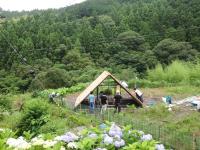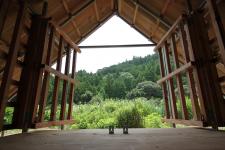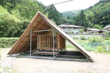 This is the self-built temporary Shinto shrine in a depopulated village in the mountainous area of kochi in Japan. For over 200 years the village used to have nine houses making up the kanamine shinto community, with a shrine set up in the upper part of the forest. However, the village started to lose its population, resulting in only one house and a neglected shrine that in 2015 was deeply injured by a heavy typhoon. In 2016 the worship structure faced a crisis and collapsed, so the inhabitants, together with the Kochi University of Technology located nearby, decided to construct a temporary shrine in the houses area.