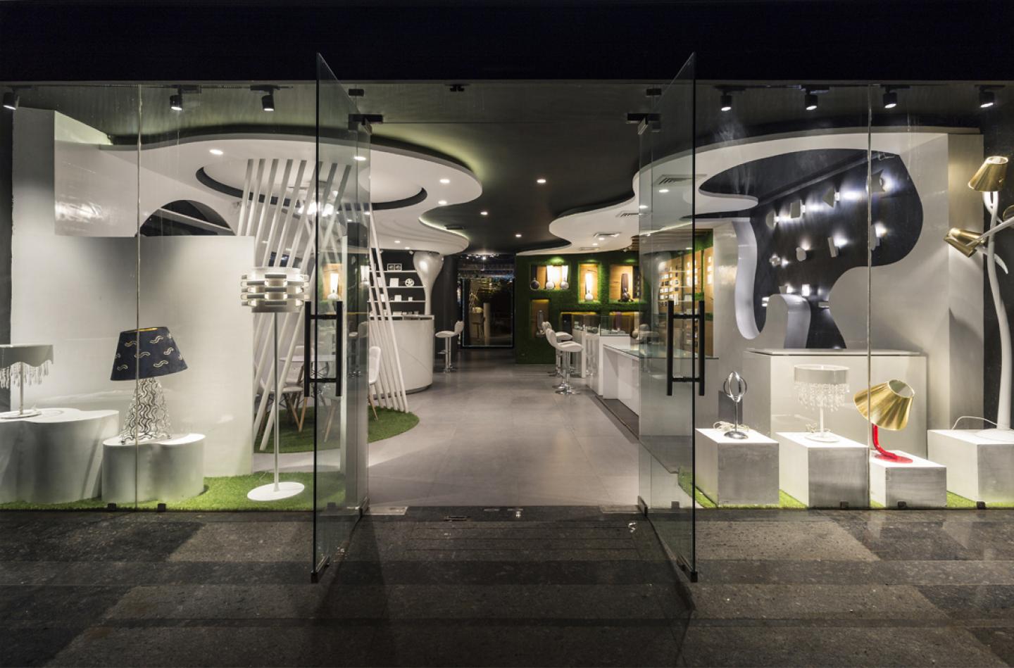 Housing unique light fixtures, the rear zone is carpeted, floor to ceiling, in black. An irregular, zigzag volume designed as a display for the fixtures, sits in the center of the space. Each fixture is given a place of importance, treated as a piece of art in an exhibition and appreciated as such. Hanging fibre optic cables with dynamic lighting extend over the entire ceiling exuding sophistication.