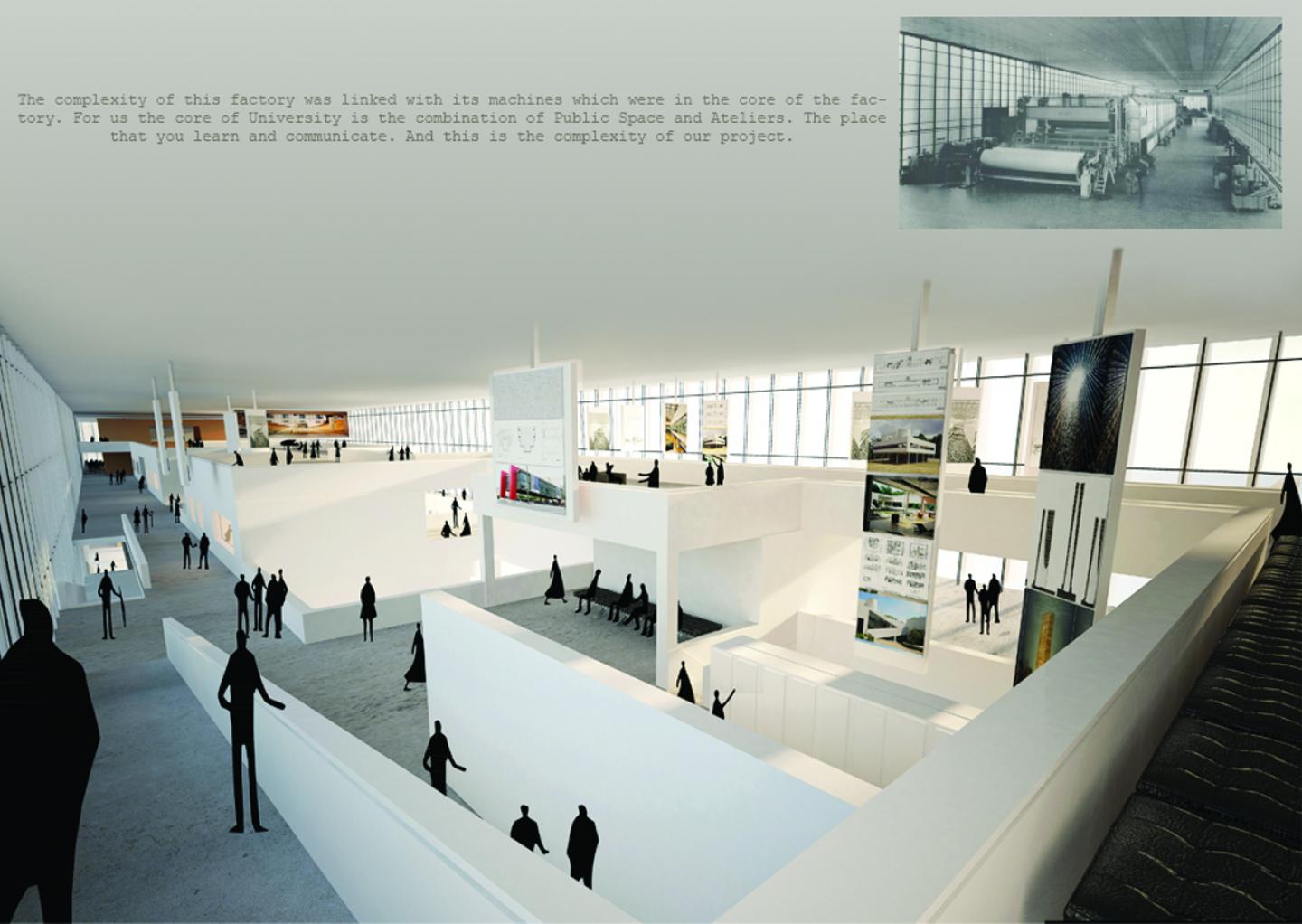 Burgo paper factory of Mantua, a work of P.L. Nervi, 20th century heritage building, has functioned as a production plant until February 2013, when it was shut down because of the crisis of the paper industry. Since the University of Mantua is not meeting the need of students properly and the abandoned factory is not part of city anymore, our goal is to use this potential to create a connection with city through the landscape strategy design and functional changes –Architecture School– in order to bring back the life to the other side of lake. The design exercise aims to propose some possible strategies that would confirm the productive function for the bridge building and that would focus design hypothesis on it and its surrounding areas. Moreover, according to its unique landscape, there is possibility to offer landscape design due to its strong connection with the lake in Mantua. This scenario will allow to start a critical consideration on the relationship between the new and the heritage, on how operate in specific contexts, on shapes and characters of open and built space typology and distribution and on the relationship between this part of the city and the Lago di Mezzo.