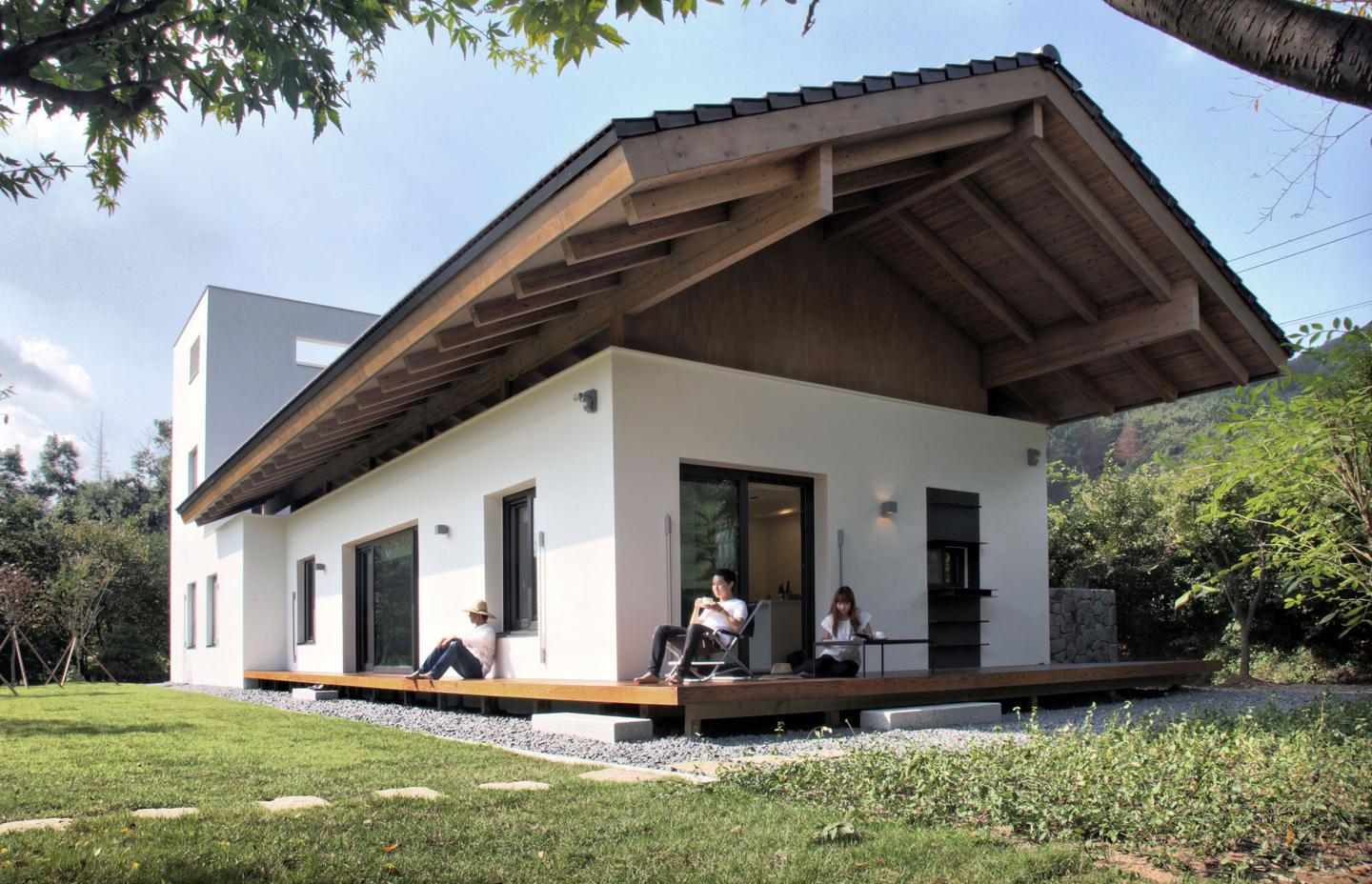 Architect: Cho, Sungik, KIRA,AIA (TRU Architects) Designers: Choi, Jaeil / Yoon, Kyungok / Park, Joonho / Kim, Doyun Location: Jinchun, South Korea Program: Single-family house Site Area: 2499m² Building area: 132m² Floor Area: 215 m² Building scope: 2F Structure: Reinforced concrete + Wood Exterior Finish: White paint + Flat roof tile Design Period: 2012.10. ~ 2013.03. Construction Period: 2013.03. ~ 2013.09. Photographer: TRU Architects