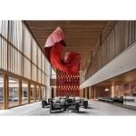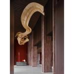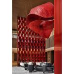 The use of red stone is inspired by the traditional building material red sandstone, which provides a unique collage of textures for each column instead of the spontaneity of red sandstone. The Ingo Maurer Yoruba Rose lamp is placed on the reception desk to greet visitors in a light and elegant manner. The hanging installation is inspired by the undulating silhouette of the roof of the Wok Ear House. The bamboo material with high plasticity is chosen as the raw material.