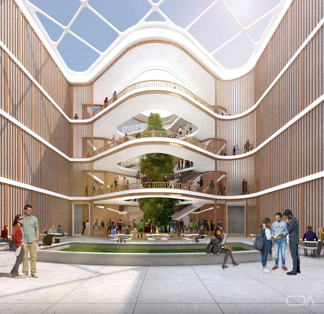CDA undertook the design of the teaching block for the institute. The block has been planned opposite the hospital, along the central vista of the campus. The brief outlined the need for infrastructure, wherein CDA pushed the envelope by formalising the goals that the design seeks to realise. The infrastructure is scalable, flexible and vibrant, keeping in mind the scope of future development and the design attempts to minimise dependence on non-renewable resources while being sustainable and self-sufficient. The user's wellbeing is intended to be enhanced by careful consideration of air quality, water and sanitation, fitness and comfort.