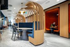 The fourth floor Cafeteria serves as an American diner and community hub to promote a sense of familiarity and connection. Circular, lattice dining booths link the different planes of the room, each expressed in oak wood to contrast with the bright seating colors and to visually soften the space.