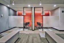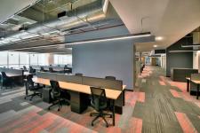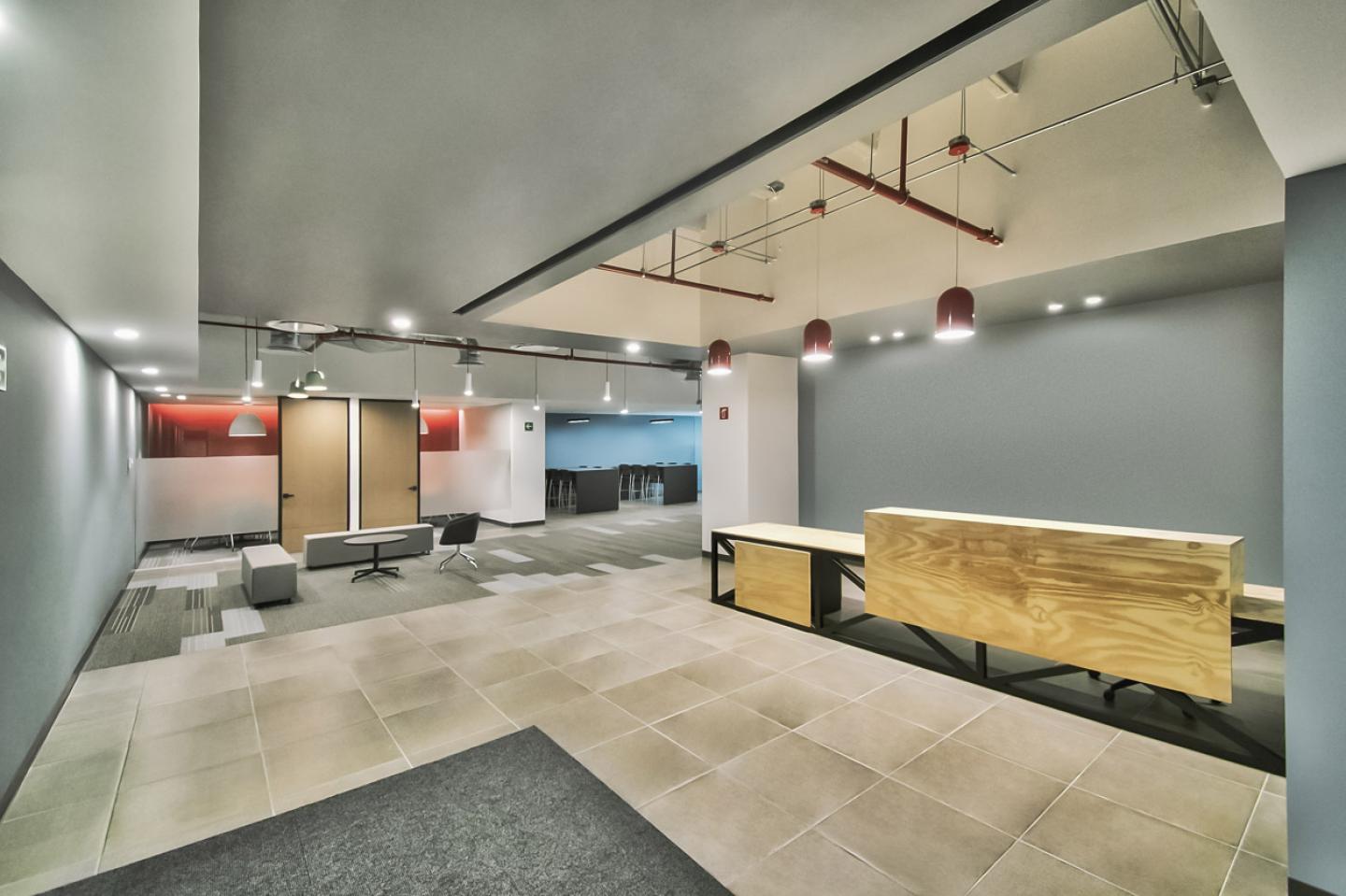 We a basic color palette each quarter or team was given identity inside the office. At the center of the main circulation the external meeting rooms, training rooms, cafeteria and support area were located. The different areas were framed with a play of color on the carpet and vinyl floors, the open or apparent plafond incorporates an industrial, simple and infrastructure image requested by the client.