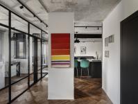 An additional home-office is in the private living quarters as well as a bedroom with black glass wardrobes that make the space appear bigger than its true size. Everything is open and exposed, a precise and appropriate concept for a couple in an attentive and respectful relationship. The parquet covers the room except for the bathing area, which was tiled and cladded in extra-large concrete-like granite tiles (1.6/3.2 m).