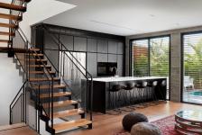 The structural walls on the ground level were designed in exposed concrete to correspond with the level’s exterior. The kitchen, lounge and dining area, all of which were designed as one large open space, were fitted with solid wood floors to warm the space up in contrast to the cool concrete. The ground level, predominantly decorated in shades of gray, wood and black, is composed of two main spaces: on one side, a quieter area that includes a reading corner and dining area and on the other, a more lively and busy area of a lounge, kitchen, and breakfast bar. The garden can be accessed from both sides, which are subtly separated by a stairwell fitted with a dominant industrial handrail.