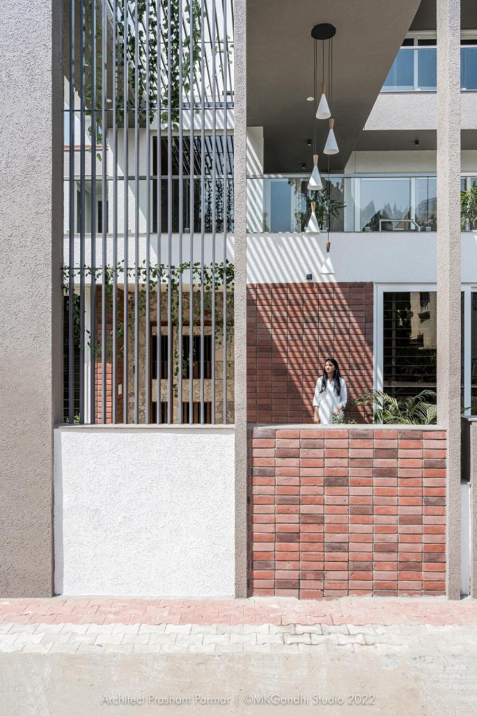In summer, the temperature of Ahmedabad touches 45 to 47 degrees keeping the city hot, especially during noon. In that extreme climatic conditions, open spaces become useless, if they are not shaded properly. Here, this shelf shading structure fulfills its purpose and benefits users to hangout in the balcony spaces even in the daytime. From the initial stage of planning, all the activities were pushed to the rear side and the front side was kept open to accommodate that space with elevated gardens on each floor. The toilets were placed on the west face which acts as a buffer for the bedrooms on the east face and cuts the heat from the west side.