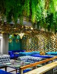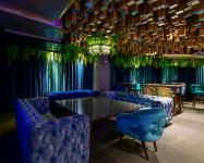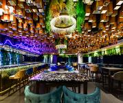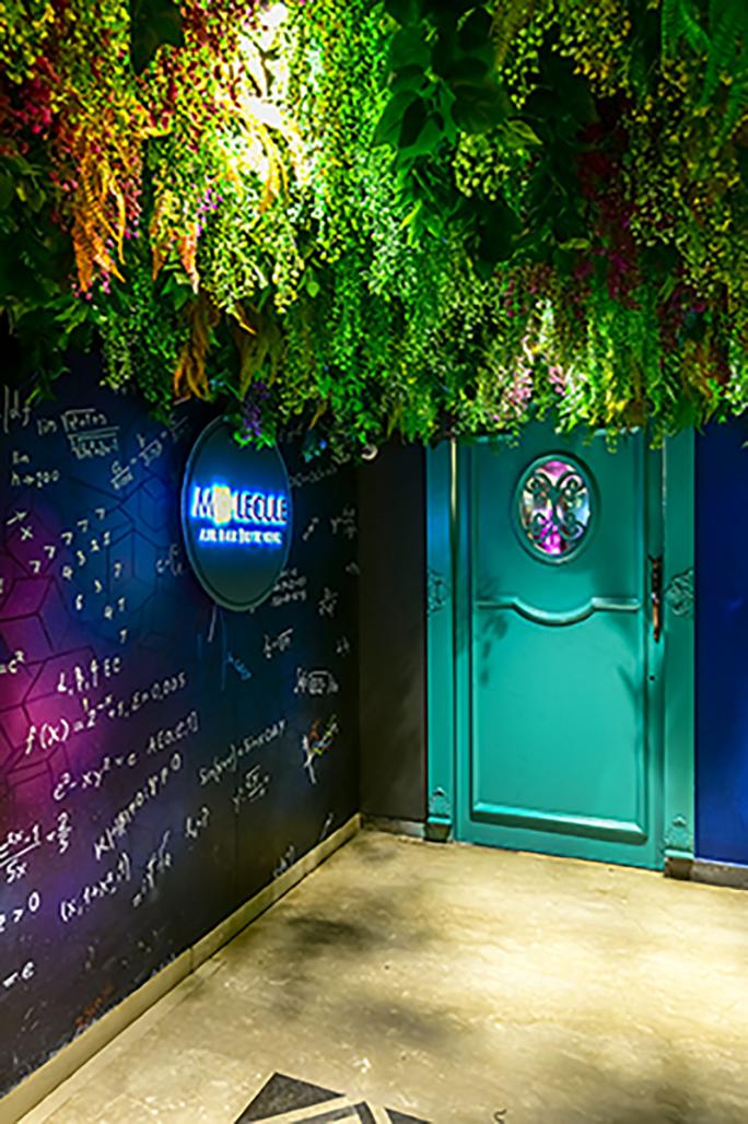 Molecule being a unique concept of an Air Bar and Kitchen which is also one of the best of its type in Central India. Located in the most uniquely designed building in the posh area of Area Colony in Bhopal which now acts as a landmark for the whole region. The entire place is a mosaic of materials with different textures and colors at each corner which gives you a unique experience and hence each time you pay a visit, you grab a different corner and never get bored. The material loudly speaks of how crazy and funky this place is with the use of pine wood cubes and mirrors hanging from the ceiling in an organic form which gives you a feel of an uneven volume which in reality is just a box. The combination of the metric lights making its way to come out from the organic form of the ceiling makes it a lot more than just a roof at your head and acts as an art piece to be admired at whenever you raise your head, while dancing or sitting at a cozy corner with a drink in you hand. The mirrors reflect the beautiful lights that also change with the sound of music and makes you feel as if the entire space is dancing along with you. The plantations hanging along the side of the dense ceiling also gives you a sense of sitting under a dense forest with all the bright colors around you. When talking of colors the space is lit with blue and red lights which breaks the monotony of the space and makes it more dramatic. The bright furniture also stands in contrast with the overall interior and could easily catch your eyes. The ambiance is very cheerful which takes you into a different realm of joy and happiness.