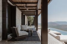 The powerful Greek sunlight helps define shapes and surfaces, playing with the textured materials, as the architects drew on the feel and rhythm of the context for both interiors and exteriors. The journey of light and the clients’ habits throughout the day led the spatial arrangement inside. Each section and route are carefully planned to support functionality and frame vistas, through visual journeys and spatial narratives that blend inside and outside, the natural and the human made. The design seeks to enhance slow living, taking its cues from the island’s lifestyle.