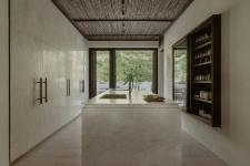 A path down a slope from the main road leads visitors to the residence’s entrance. The complex’s size is cleverly broken down into smaller volumes, which are interconnected through circulation routes and in-between spaces - some indoors and some open-air. The main home is divided into two low buildings linked by a semi-enclosed area with a water feature. The design merges natural materials that are often used in the local vernacular, such as wood and stone. At the same time, the atmosphere is distinctly contemporary, blending Block722’s inherent Scandinavian sensibility and organic minimalism with Japanese architecture influences. This nod to Japan unfolds through the design’s refreshing simplicity of clean, almost austere lines that balance the materials’ natural, tactile nature and the overall craft-rich approach.