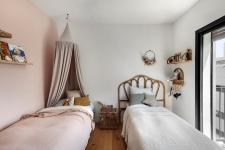 The couple’s two daughters share a beautiful bedroom with a west-facing balcony. Their beds, which are very different in style, were placed parallel to each other. Despite, or perhaps as a result of their style difference, the room feels magically harmonious.