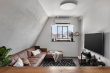 The top level includes a minimalist kitchen, a bar, a very cozy living room, and a spacious dining area that is located alongside the exit to the rooftop terrace. The latter is the focal leisure and entertainment spot in the apartment - largely due to its unusual size and breathtaking view of the city.