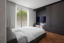 The entrance to the master bedroom is through a corridor of cupboards. Those, as well as the door to the en-suite, are concealed by engraved carpentry. The same carpentry design was used for the bed headboard, which is combined with hanging reading lights, as well as the cupboard fitted across from the bed. This creates a harmonious look with ample storage space.