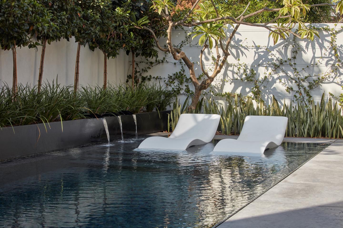 A lounging area and a dining area were designed on either side of the pool, each continuing their respective internal areas.