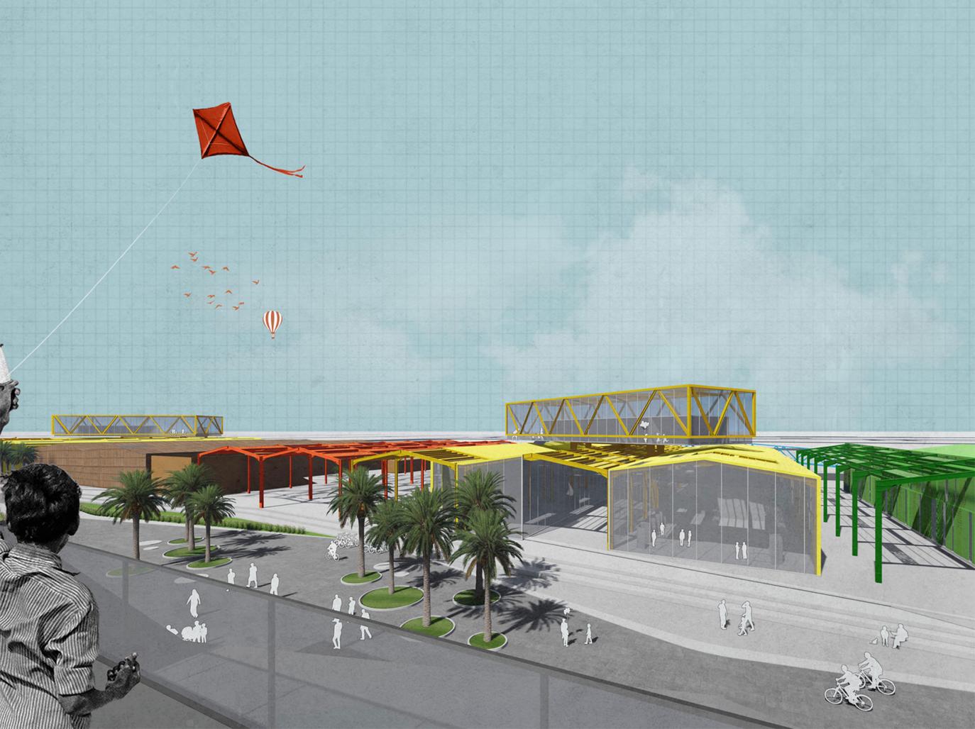 Project components: culture area , art area, artists’ residences area, agriculture (greenhouses) area, pedestrian bridge.