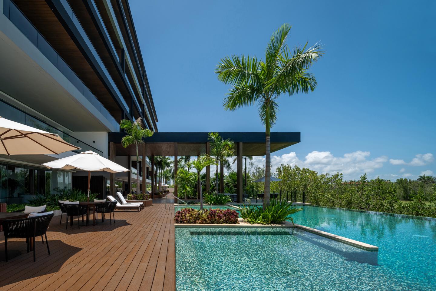 It is a vertical housing complex located in Puerto Cancún, an area north of the city. The property is located between two green bodies, product of a golf course that surrounds the property, for which, it was imperative from the beginning to prioritize the views towards these areas, taking into account that one of them has the Caribbean Sea right after it, while the second is next to a large nature reserve. In the other two sides of the plot, there are multi-family residential properties.