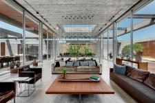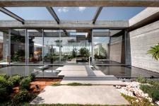 The home walls are glass with exposed concrete roofing and steel pillars that support the construction. This composition further contributes to the home's discourse and the integral tension between the interior and lush.