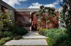Those who enter the home discover an expansive and luscious inner garden with sleek facades made from wooden dividers, bare wood and concrete, and an enormous reflective pool with trees situated inside. Further placed in the collection are floating slabs of concrete that comprise the path leading up to the property, which is entered through a wall of wooden dividers.