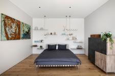 The kitchen includes a wooden cladding wall that forms the area's power outlets. Hidden away are electrical appliances and storage, which allows the kitchen to embody clean lines and minimalism while enabling the materials to express themselves fully. A large island made from Dekton, with bar stools on one side, and as mentioned, the patio across provides beautiful and tranquil scenery for the inhabitants while residing in the space.