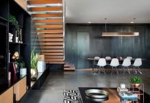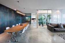 The kitchen did not undergo extended changes, with the exception of adding black backsplashes and light fittings. In contrast, the dining area went through a dramatic change where the boundaries between the private and the communal were stretched: the powerful dark wall surrounding the area conceals hidden doors opened with the touch of a button, giving the place a dynamic and somewhat mysterious vibe. The blue staircase wall serves as a conceptual extension of the dark wall, its blue shade corresponding with the skies that can be seen through the glass doors, as well as with the shade of the lounge library and the light banister color. The dining corner blends in the space effortlessly and the brass dining table legs set a contrast to the weathered concrete wall, without overpowering the space.