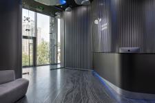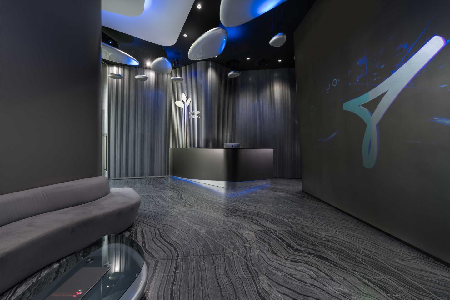 As in nature, there are no rigid forms here – soft curves of boulder sofas, floating drops of the ceiling, a counter illuminated from below reception.Color palette. Natural shades of fog, granite rocks, metal awaken ancient instincts – it’s safe, safe, comfortable, cozy here. The entire innovative interior is created using premium building materials that will last for many years.