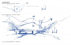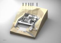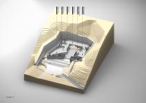 In the design process, we intentionally strengthened textual thinking as the clue of space generation and the methodology of the entire process. The proposal associates space and forms with text and symbol as the façade adopts the writing form of the Chinese Character ‘山’(mountain), filling the triangular void left by the demolished hotel on the horizon. The newly introduced structure, together with the uplifting green land on both sides, forms a mountain-shaped silhouette of ups and downs, humbly restoring the ecological scars, maximum protecting and adapting to the original topography.