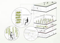 An educational path has been designed to provide knowledge for visitors to the center, starting from the main entrance and passing through the education section, where researchers and the indoor plant laboratory can be seen, and ends with the exhibition related to the community garden and outdoor smart farm. Moreover, visitors can end their knowledge journey by walking on the roof of the building that serves as an observatory for the local community and villages, the neighbourhood, and the picturesque surrounding nature.